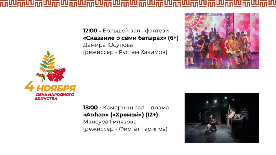 4 ноября 2025 года, в День народного единства, Национальный молодежный театр Республики Башкортостан им. М. Карима подготовил насыщенную программу для зрителей всех возрастов, посвященную сплочённости, историческому наследию и культуре родного края. Приглашаем вас отметить этот важный государственный праздник вместе с театром!