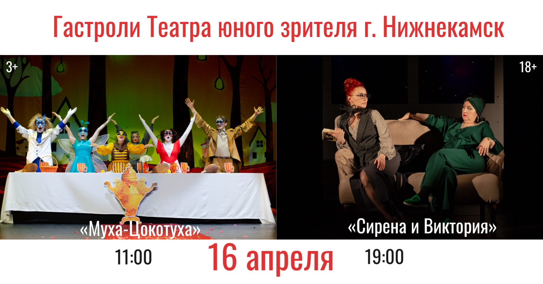 16 апреля 2026 года на сцене Национального молодежного театра РБ им. М. Карима выступит Театр юного зрителя из Нижнекамска. Коллектив представит два разножанровых спектакля: поучительную историю для детей и лирическую комедию для взрослой аудитории.